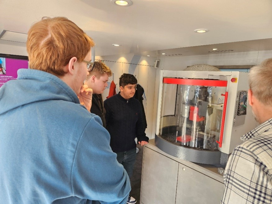 Am 19. März besuchten Schüler der 9. und der 9V1-Klasse den Metall- und Elektrotruck in Kulmbach. Zu Beginn der Veranstaltung stellten zahlreiche Auszubildende der Firma GlenDimplex ihre Berufe vor und schilderten Vorteile, aber auch Herausforderungen ihrer Ausbildung. Anschließend konnten die begeisterten Schülerinnen und Schüler Einblicke in Berufe der Metall- und Elektroindustrie gewinnen, indem sie eine CNC-Fräse und Roboterarme bedienen durften. Außerdem gab es die Möglichkeit Stromkreisläufe zu bauen und Wissen über verschiedene Elektroanschlüsse zu sammeln. Im Anschluss erhielt die Gruppe eine Führung durch die Firma GlenDimplex. Dort konnten sie die einzelnen Arbeitsschritte bei der Herstellung und Auslieferung einer Wärmepumpe miterleben. Einen herzlichen Dank an die Firma GlenDimplex für den praxisnahen Einblick in die Berufswelt!